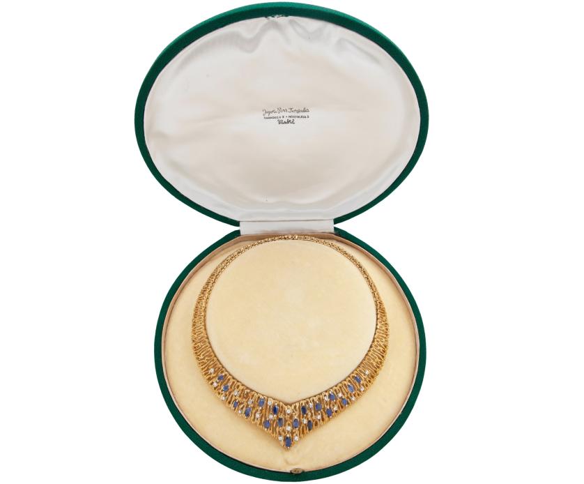 Gargantilla realizada en oro de 18kt. Diseño ancho y calado adornado en el centro con zafiros en talla oval con peso total aprox 4.50ct y diamantes en talla brillante con peso total aprox 1.10ct Cierre: Caja con lengüeta y ocho de seguridad Longitud: 42cm aprox Peso: 79,70gr.