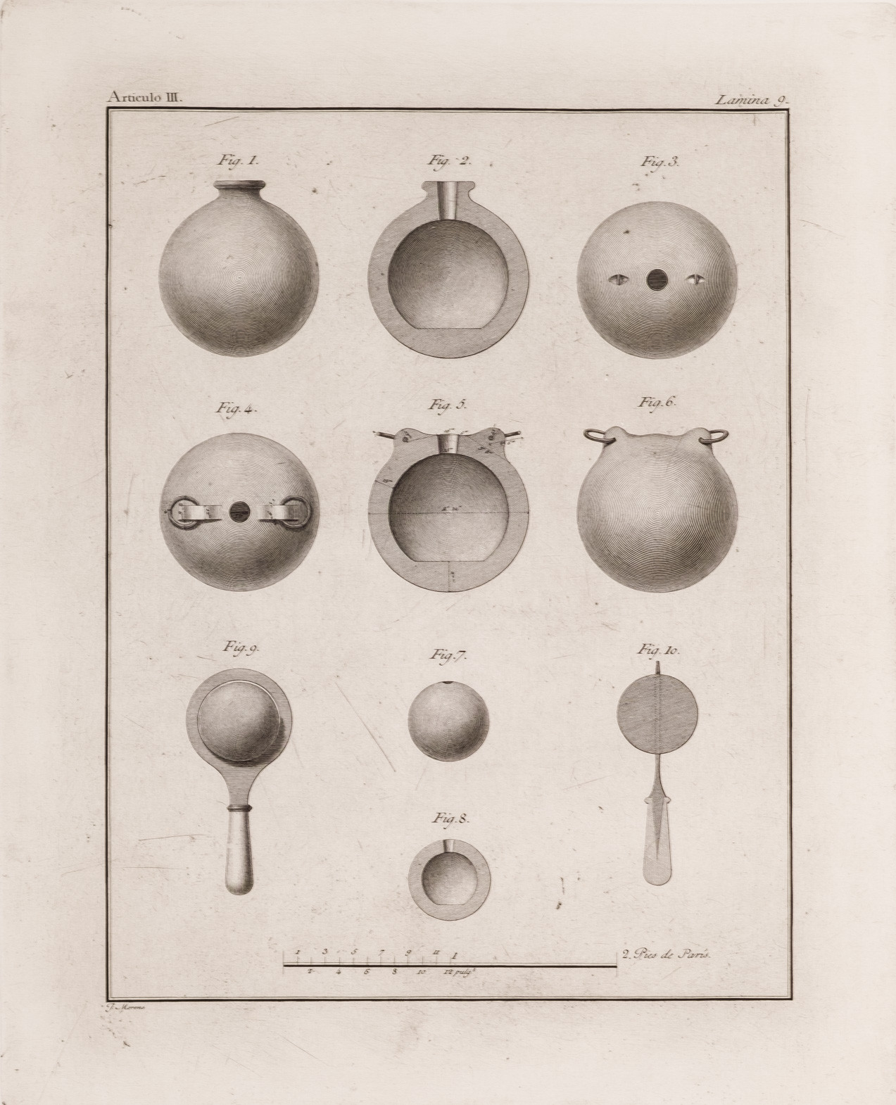 "Grabado". Grabado al aguafuerte mostrando lo que parece ser un proceso de modelar, en 10 figuras. Escala métrica en la base. Grabado por J. Moreno. Huella: 33.5 x 27 cm.