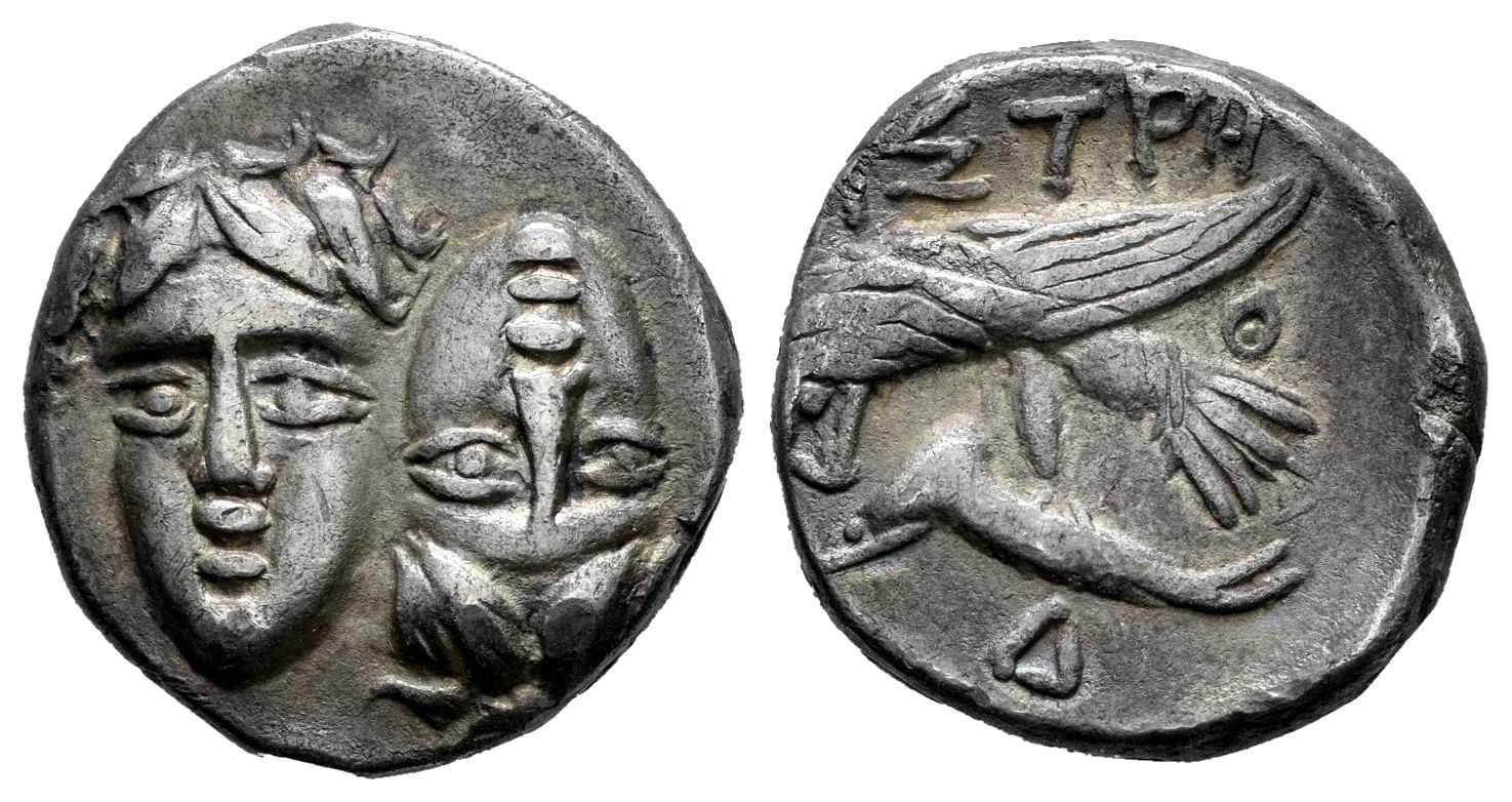 Moesia. Istros. Dracma. 340-313 a.C. (SNG Stancomb-142). (Hgc-3.2,1801). Anv.: Dos cabezas masculinas de jóvenes enfrentadas, cabeza derecha invertida. Rev.: IΣTPIH águila marina sobre delfín a izquierda, entre ellos Θ; Δ debajo. . 4,93 g. Ligera pátina. MBC+/MBC. Est...200,00.