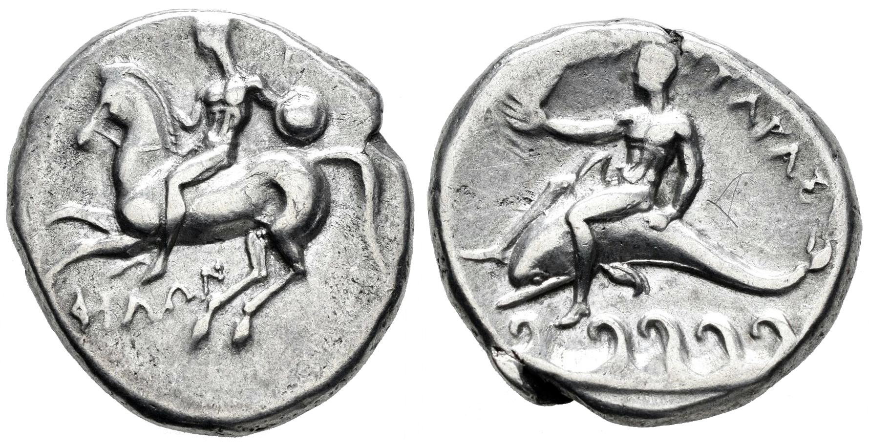 Calabria. Tarentum. Didracma o Nomos. 280-272 d.C. (HN Italy-694). (Vlasto-686). Anv.: Guerrero desnudo a caballo a la izquierda, sujetando bridas en la mano derecha y pequeño escudo redondo en la izquierda; arriba a la derecha, E(Y); debajo del caballo, ΦIΛΩN. Rev.: TAPAΣ. Joven oikista, desnudo, cabalgando sobre un delfín hacia la izquierda, sosteniendo a Nike en su mano derecha y apoyando la izquierda sobre el delfín; debajo, olas. . 7,82 g. MBC+. Est...220,00.
