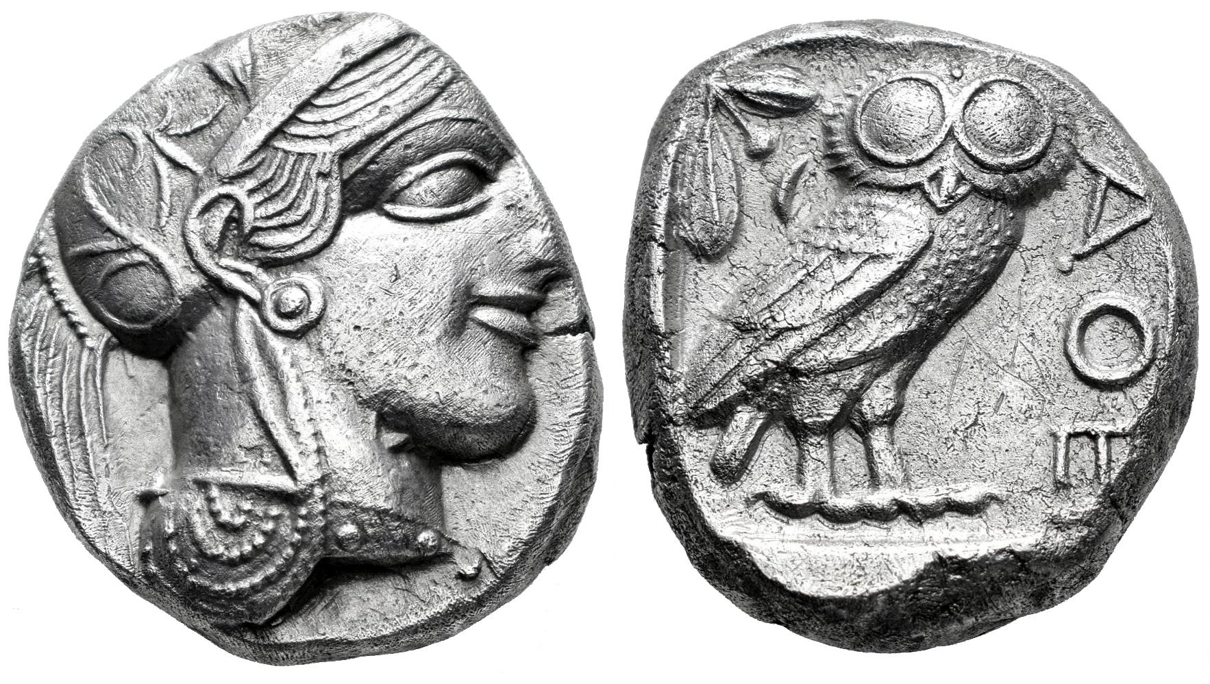 Attica. Atenas. Tetradracma. 454-404 a.C. (Gc-2526). (Sng Cop-31). (Kroll-8). Anv.: Cabeza de Atenea a derecha, con casco ático con cresta, adornado con tres hojas de olivo sobre la visera y palmera espiral. Rev.: Lechuza en pie a derecha, mirando de frente con rama de olivo y creciente detrás, delante ΑΘΕ. Todo dentro de cuadrado incuso. . 16,77 g. Metal algo poroso. MBC+. Est...700,00.