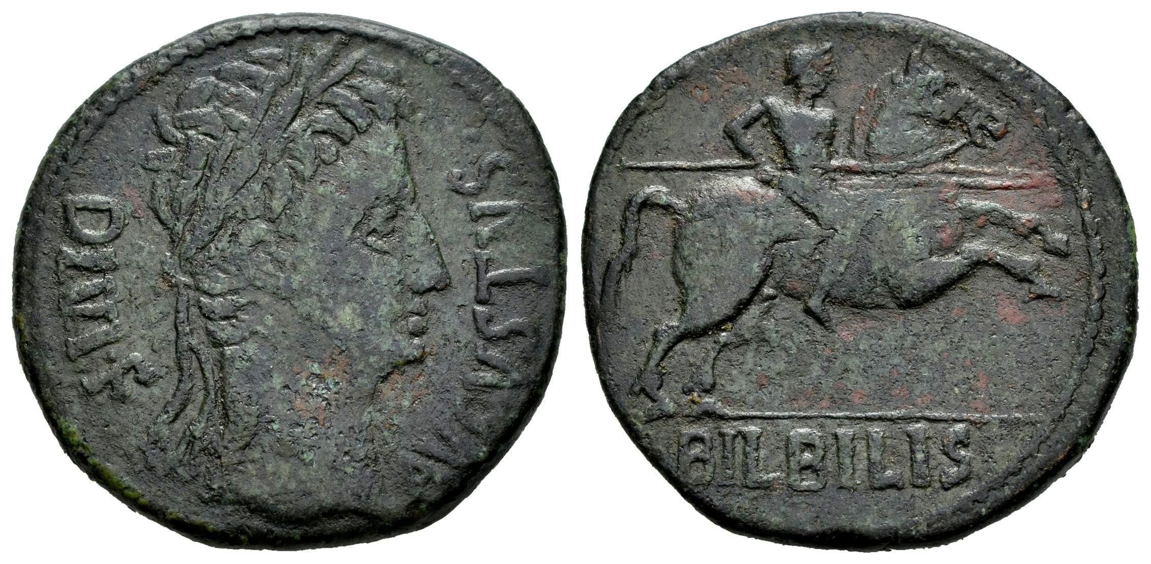 Bilbilis. Época de Augusto. As. 27 a.C-14 d.C. Calatayud (Zaragoza). (Abh-276). (Acip). Anv.: Cabeza laureada de Augusto a derecha, leyenda AVGVSTVS. DIV. F. Rev.: Jinete lanceando, debajo BILBILIS. . 10,15 g. MBC-/MBC-. Est...100,00.