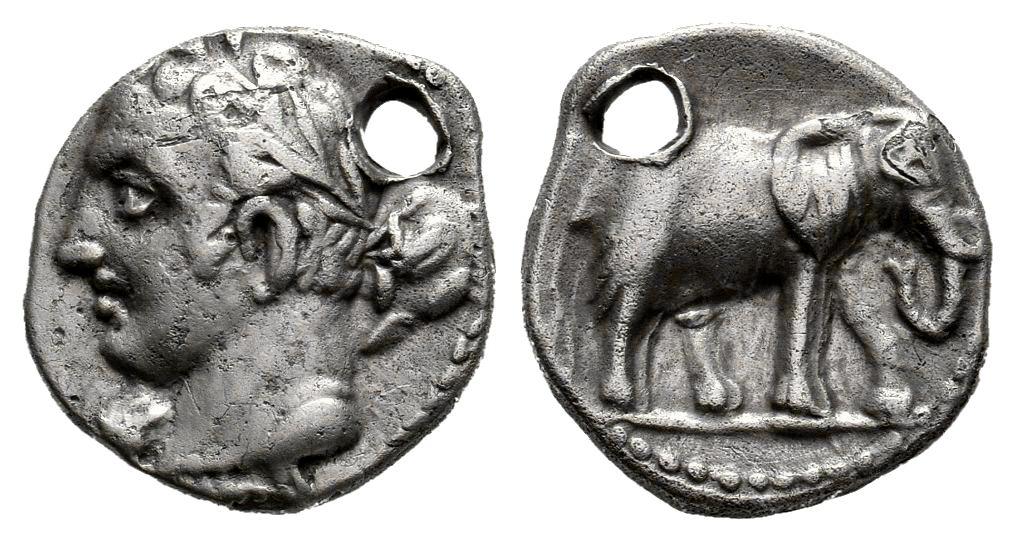 Acuñaciones Hispano-Cartaginesas. 1/4 shekel. 235-220 a.C. Cartagena (Murcia). (Abh-487). (Acip-555). Anv.: Cabeza de Melkart-Heracles laureada a izquierda, con clava. Rev.: Elefante a derecha. . 1,64 g. Agujero. MBC+. Est...300,00.