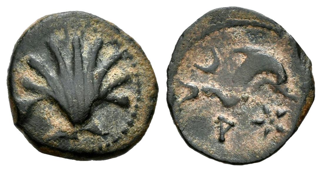 Arse-Saguntum. Sextante. 170-20 a.C. Sagunto (Valencia). (Acip-1979). (C-35). (Abh-2064). Anv.: Concha. Rev.: Delfín a derecha, encima creciente, debajo letra ibérica A y estrella. . 1,24 g. MBC+. Est...75,00.