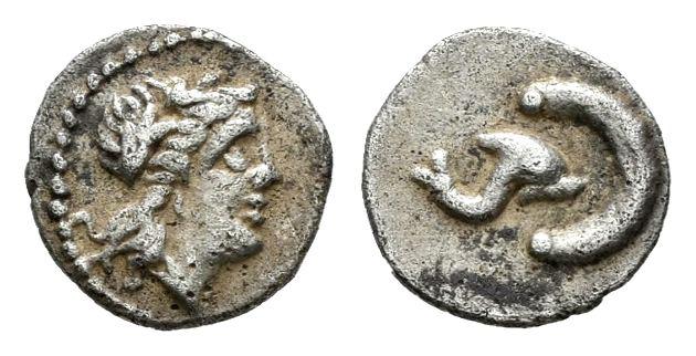 Emporiton. Tartemorión. Acuñaciones del s. III a.C. S. Martín de Ampurias (Gerona). (Acip-530). Anv.: Cabeza masculina a derecha. Rev.: Delfín y creciente. . 0,21 g. Muy rara. MBC+. Est...300,00.