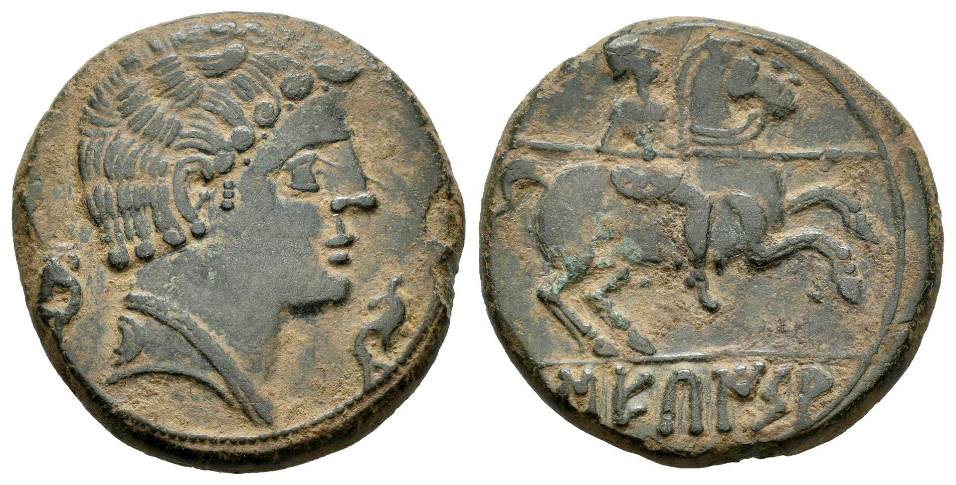 Sekaisa. As. 120-20 a.C. Zona de Aragón. (Acip-1560). (Abh-2131). Anv.: Cabeza masculina a derecha entre dos delfines. Rev.: Jinete con lanza a derecha, debajo SEKAISA. . 8,25 g. MBC+. Est...175,00.