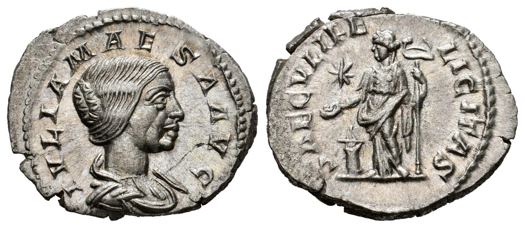 Julia Maesa. Denario. 218-222 d.C. Roma. (Ric-IV 272). (Bmcre-81). (Rsc-45). Anv.: IVLIA MAESA AVG. Busto drapeado a la derecha. Rev.: SAECVLI FELICITAS. Felicitas en pie de frente, mirando a la izquierda, sosteniendo un caduceo y sacrificando sobre un altar iluminado; estrella en el campo izquierdo. . 3,01 g. Magnífico ejemplar. Brillo original. Rara en esta conservacón. SC-. Est...350,00.