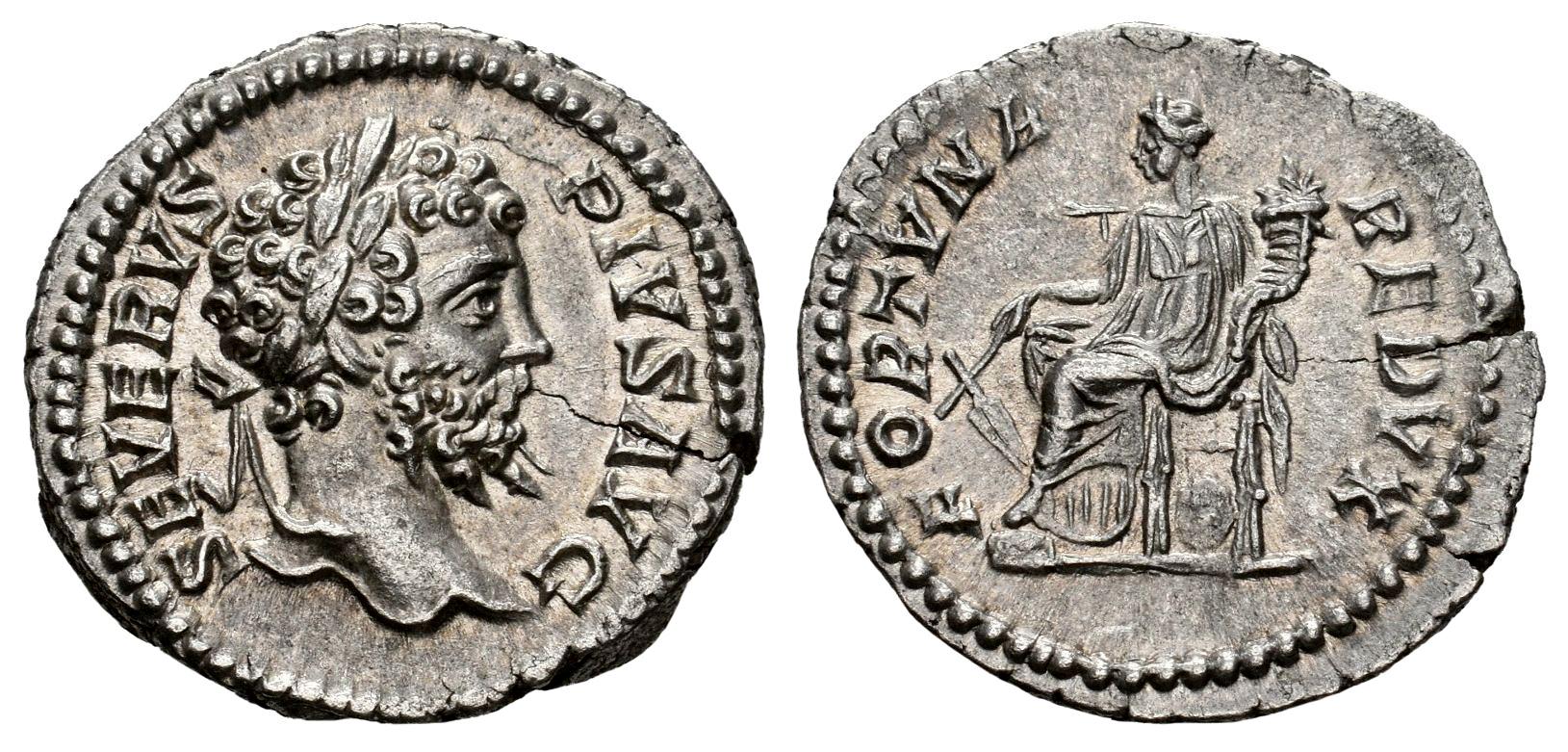 Septimio Severo. Denario. 201-210 d.C. Roma. (Ric-264a). (Bmcre-32). (Rsc-181). Anv.: SEVERVS PIVS AVG. Cabeza laureada a la derecha. Rev.: FORTVNA REDVX. Fortuna sedente a la izquierda, sosteniendo timón y cornucopia; rueda debajo. . 3,51 g. Restos de brillo original. Leve grieta. Atractiva. EBC+. Est...200,00.