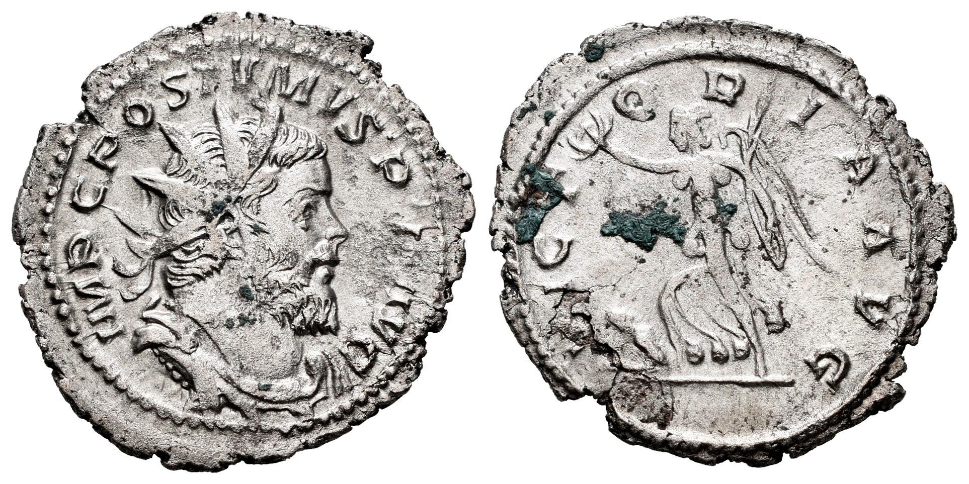 Póstumo. Antoniniano. 260-261 d.C. Treveri. (Ric-89). (Rsc-377a). Anv.: IMP C POSTVMOVS P F AVG. Busto radiado, drapeado y con coraza a derecha. Rev.: VICTORIA AVG. Victoria avanzando a izquierda, portando corona y palma, pisando cautivo sedente a izquierda. . 3,72 g. Depósitos en reverso. MBC+. Est...50,00.