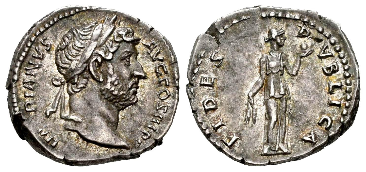 Adriano. Denario. 136 d.C. Roma. (Ric-II 3.2199). (Bmcre-630). (Rsc-717). Anv.: HADRIANVS AVG COS III P P. Cabeza laureada a derecha. Rev.: FIDES PVBLICA. Fides en pie a derecha, portando espigas y un cesto de frutas. . 3,48 g. Suave pátina. EBC. Est...140,00.