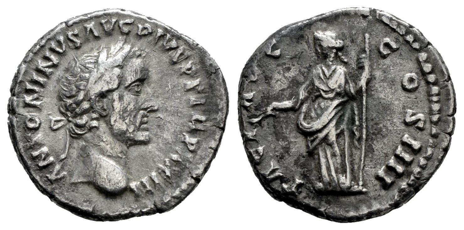 Antonino Pío. Denario. 159-160 d.C. Roma. (Ric-III 301). (Bmcre-981). (Rsc-573). Anv.: ANTONINVS AVG PIVS P P TR P XXIII. Cabeza laureada a la derecha. Rev.: PACI AVG COS IIII. Pax en pie a la izquierda, sosteniendo rama y cetro. . 2,99 g. MBC-/MBC. Est...65,00.