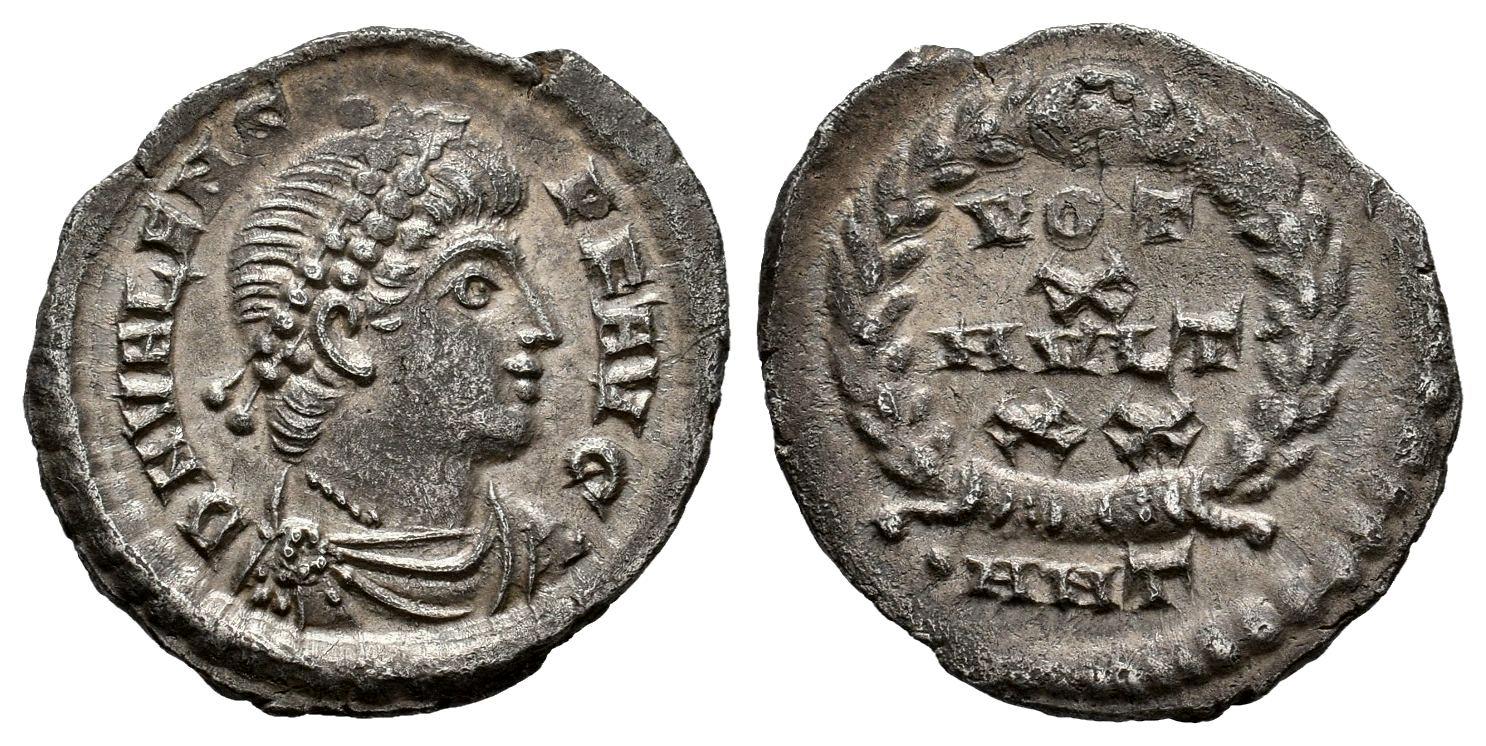 Valens. Silicua. 367-375 d.C. Antioquía. (Ric-34b2). Anv.: D N VALENS P F AVG. Busto con diadema de perlas, drapeado y coraza hacia la derecha. Rev.: VOT X MVLT XX en cuatro líneas dentro de una corona con una joya en el ápice; • ANT en el exergo . . 1,78 g. Suave pátina. EBC-/MBC+. Est...200,00.