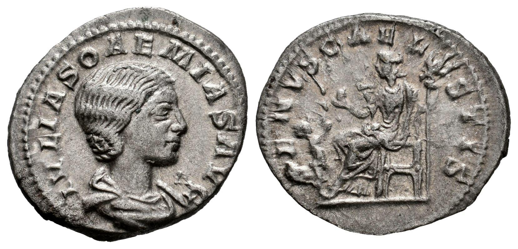 Julia Soemias. Denario. 218-222 d.C. Antioquía. (Ric-243). (Bmcre-55). (Rsc-14). Anv.: IVLIA SOEMIAS AVG. Busto drapeado hacia la derecha. Rev.: VENVS CAELESTIS. Venus sedente a la izquierda, sosteniendo una manzana y un cetro; a la izquierda, niño que se acerca a ella. . 2,63 g. Atractiva. MBC+. Est...150,00.