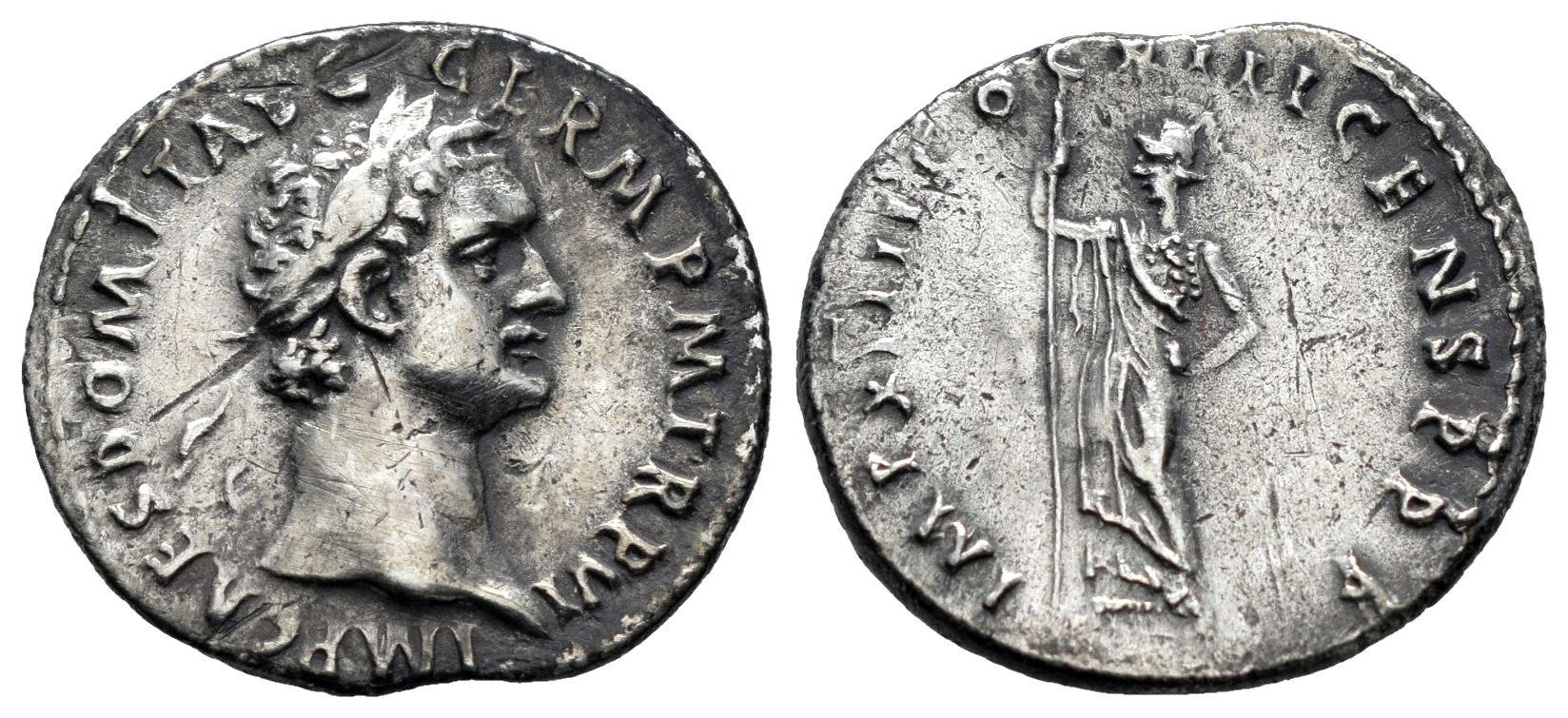 Domiciano. Denario. 87 d.C. Roma. (Ric-511). (Bmc-107). (C-213). Anv.: IMP CAES DOMIT AVG GERM P M TR P VI. Cabeza laureada a la derecha. Rev.: IMP XIIII COS XIII CENS P P P. Minerva en pie, de frente, mirando a la izquierda, portando una lanza en su mano derecha. . 3,18 g. Ligeramente limpiada. MBC+/MBC. Est...140,00.
