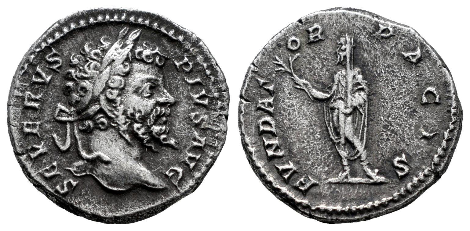 Septimio Severo. Denario. 202-210 d.C. Roma. (Ric-IV 265). (Bmcre-330). (Rsc-205). Anv.: SEVERVS PIVS AVG. Cabeza laureada a la derecha. Rev.: FVNDATOR PACIS. Emperador, velado y con toga, en pie a la izquierda, sosteniendo una rama y un rollo. . 3,23 g. Metal algo poroso. MBC+. Est...80,00.