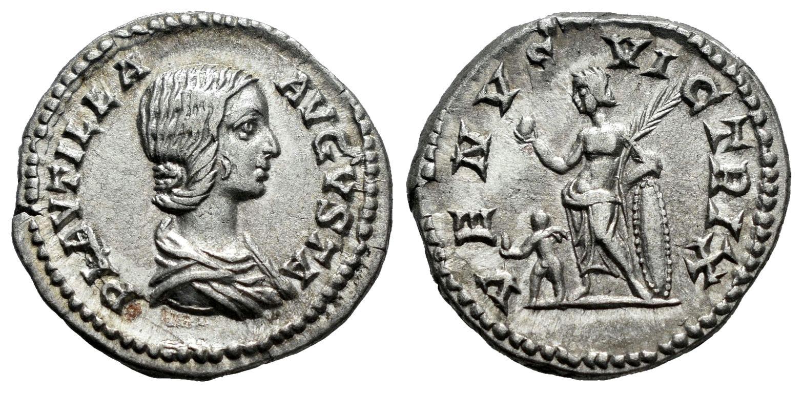 Plautilla. Denario. 202-205 d.C. Roma. (Ric-IV 369). (Bmcre-429). (C-25). Anv.: PLAVTILLA AVGVSTA. Busto drapeado a la derecha. Rev.: VENVS VICTRIX. Venus en pie de frente, mirando a la izquierda, sosteniendo una manzana y una palma, apoyando el codo sobre escudo; Cupido a los pies de la izquierda. . 3,25 g. Conserva la etiqueta original. Ex Classical Numismatic Group 317 (18/12/2013), lote 324. Originalmente encapsulada por NGC como AU y extraída de su cápsula con posterioridad. SC-. Est...200,00.
