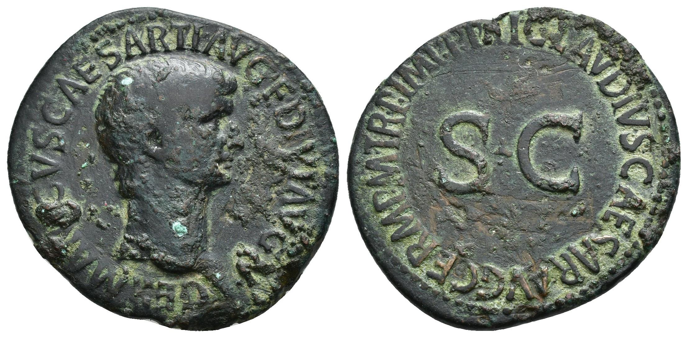 IMPERIO ROMANO. GERMÁNICO (bajo Claudio). As. Roma (50-54 d.C.). A/ Cabeza a der.; GERMANICVS CAESAR TI AVG F DIVI AVG N. R/ SC; TI CLAVDIVS CAESAR AVG GERM P M TR P IMP P P. AE 10,42 g. 30,2 mm. RIC-106. Oxidaciones. Pátina oscura. BC+/MBC-.