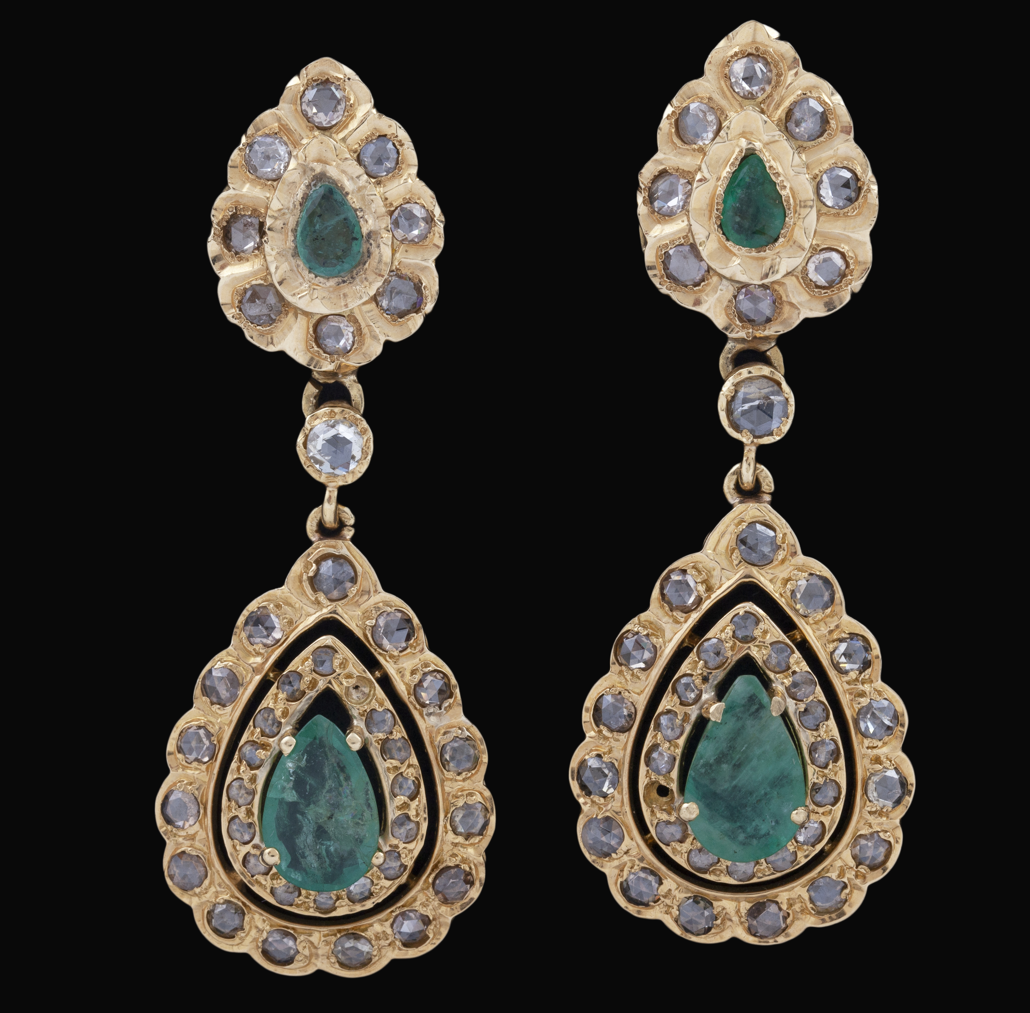 Juego de pendientes articulados en dos partes realizados en oro 18 kt con esmeraldas y brillantes rosas