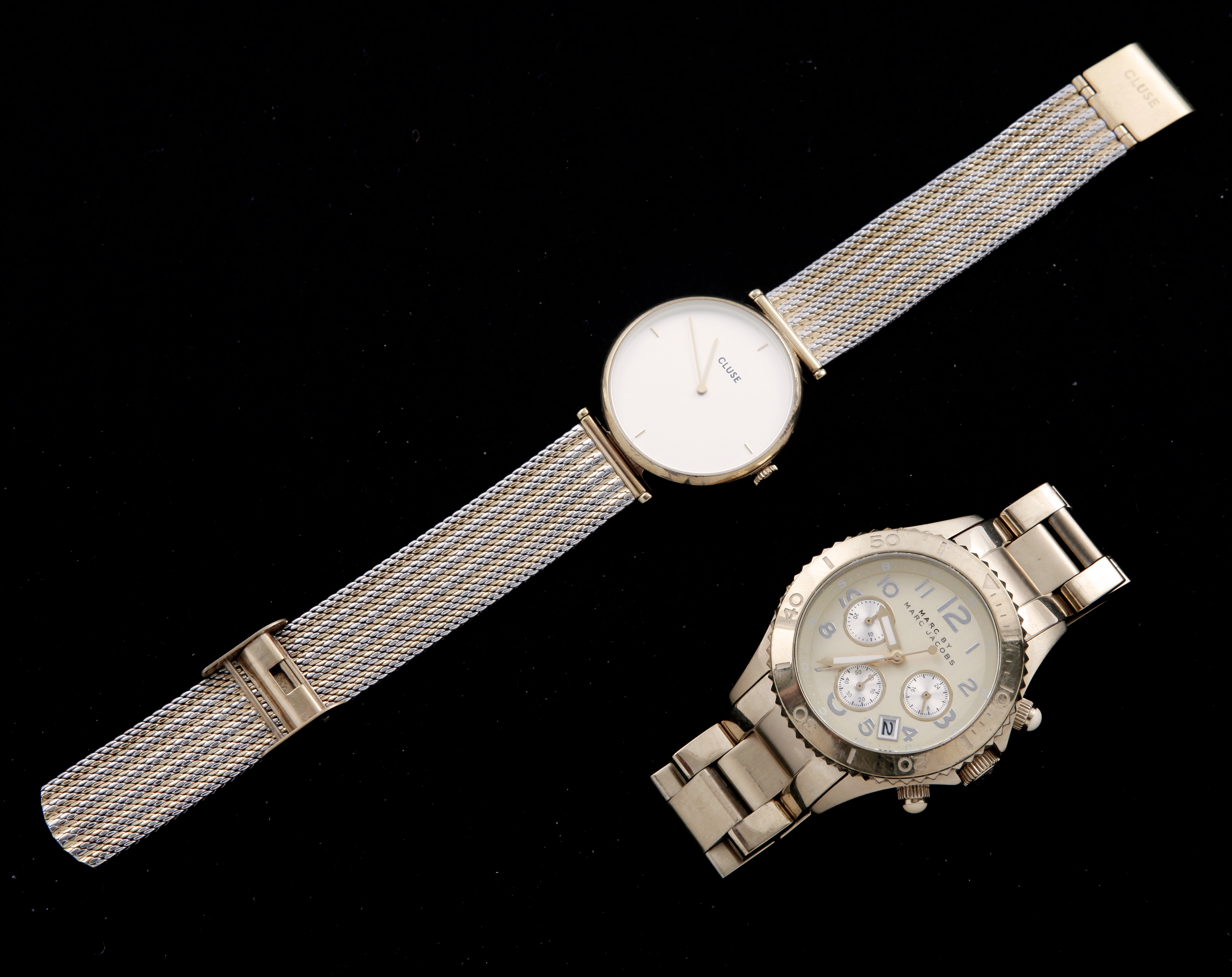 Dos relojes de señora; los dos con armix en acero dorado, uno de ellos con calendario a y veinte.