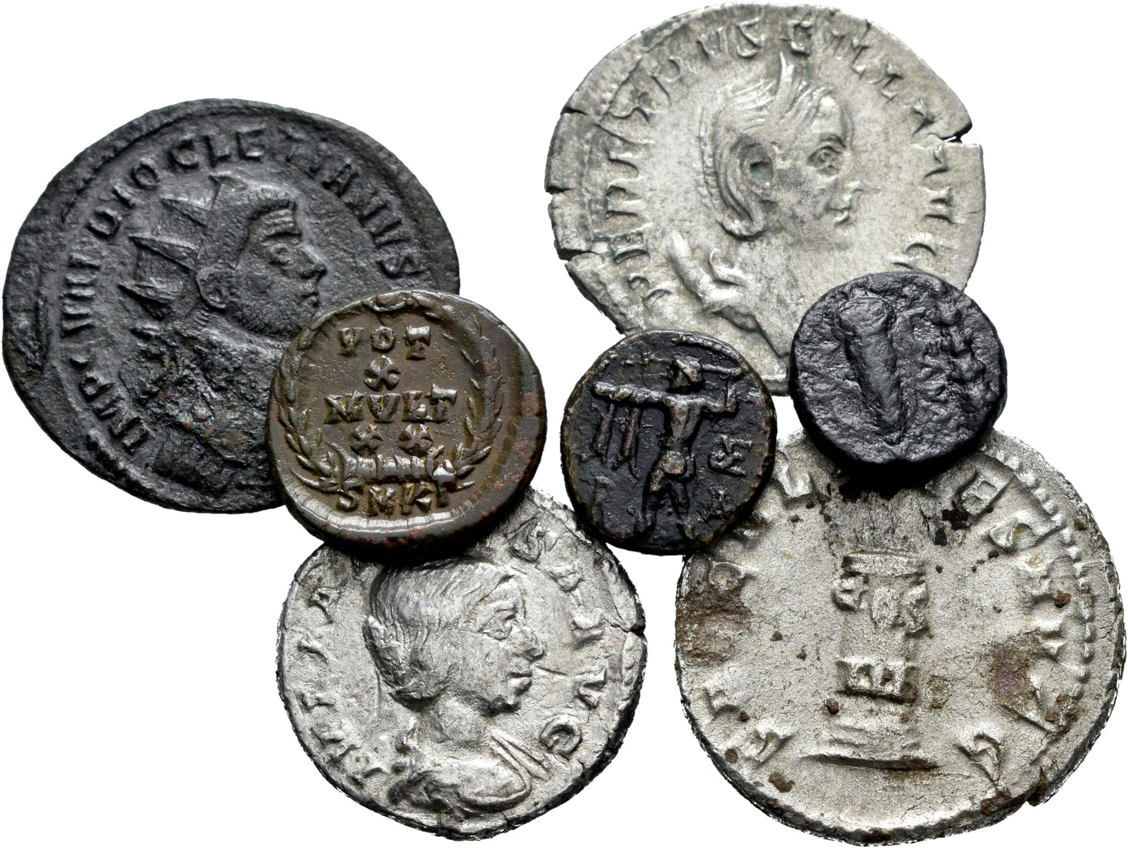 Lote de 7 monedas comprendiendo desde la Antigua Grecia al Imperio Romano. Diferentes valores y emperadores. Ag/Ae. A EXAMINAR. BC+/MBC+. Est...200,00.