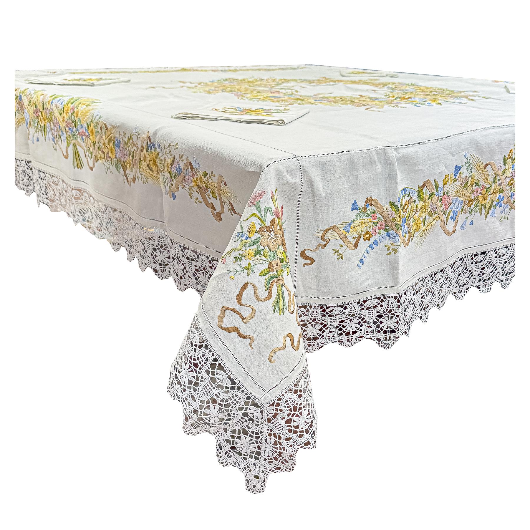 Mantelería en tela de hilo con rica decoración bordada de motivos florales. Perfil de encaje de bolillo. Se compone de mantel, 6 servillestas y 6 servilletas pequeñas. Algunos pequeños desperfectos en vainica. Algunas manchas. Medidas: 170 x 170 cm