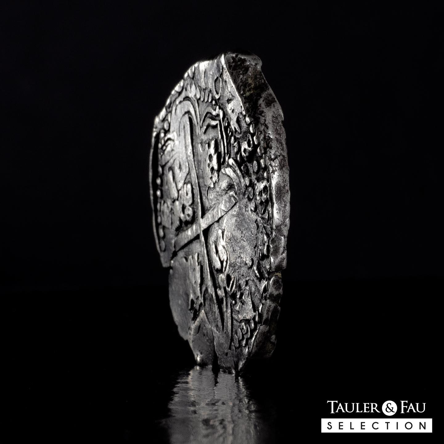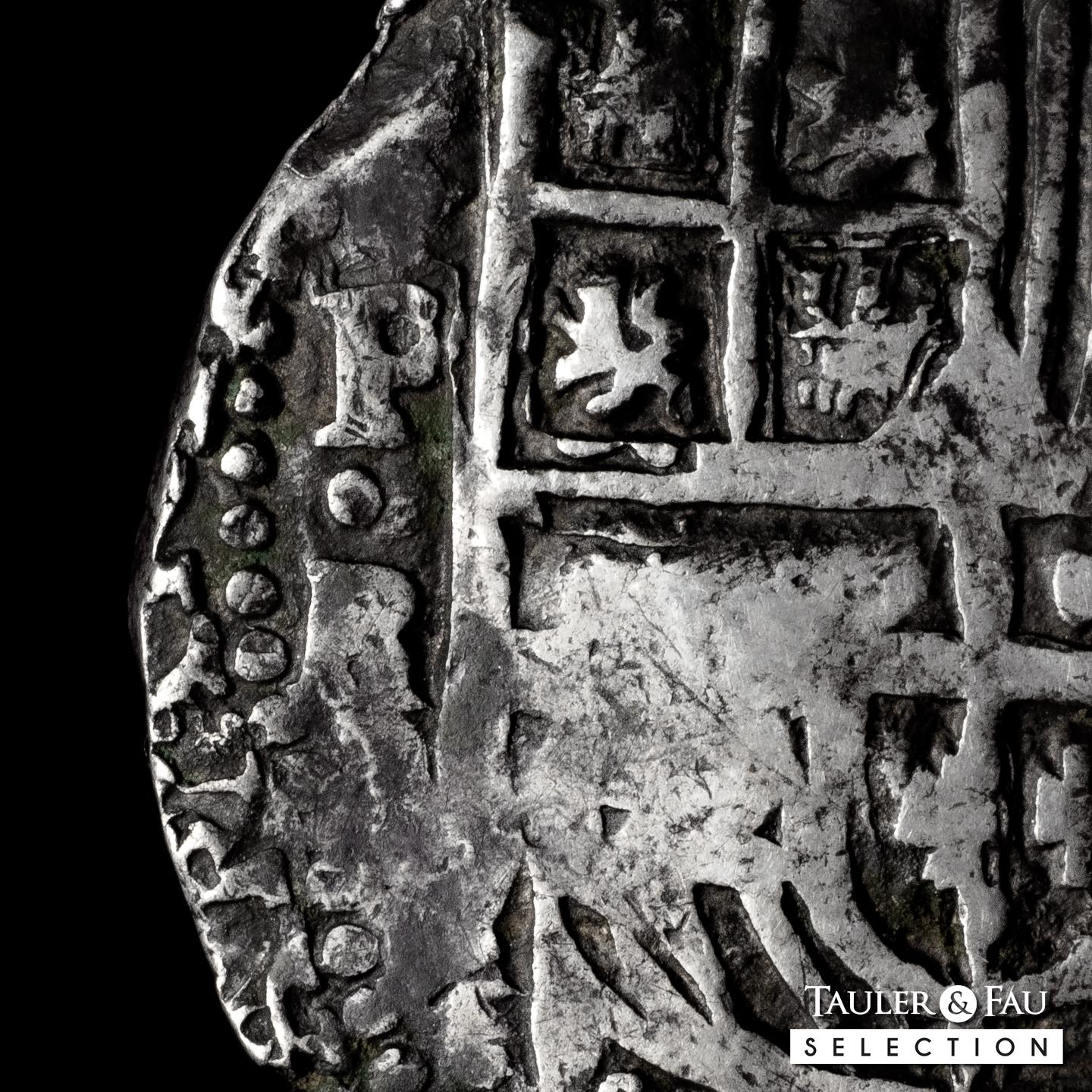 Felipe IV (1621-1665). 8 reales. 1648. Potosí. R (Felipe Ramírez de Arellano). (Cal-no cita). (Km-19a). . 27,44 g. Extremadamente rara. Tercer ejemplar conocido, uno de ellos fue subastado por Daniel F. Sedwick el 01/05/2014 y se vendió por más de 9.500 dólares. El que presentamos es, probablemente, el mejor ejemplar conocido, ya que el P-punto-R y la fecha son 100% completos y claros, con el escudo y la cruz también completos. Este ensayador fue finalmente condenado a muerte por su papel en el escándalo de la falsificación en la ceca de Potosí. Sin oxidaciones marinas, habituales en esta emisión. MBC+. Est...3000,00.