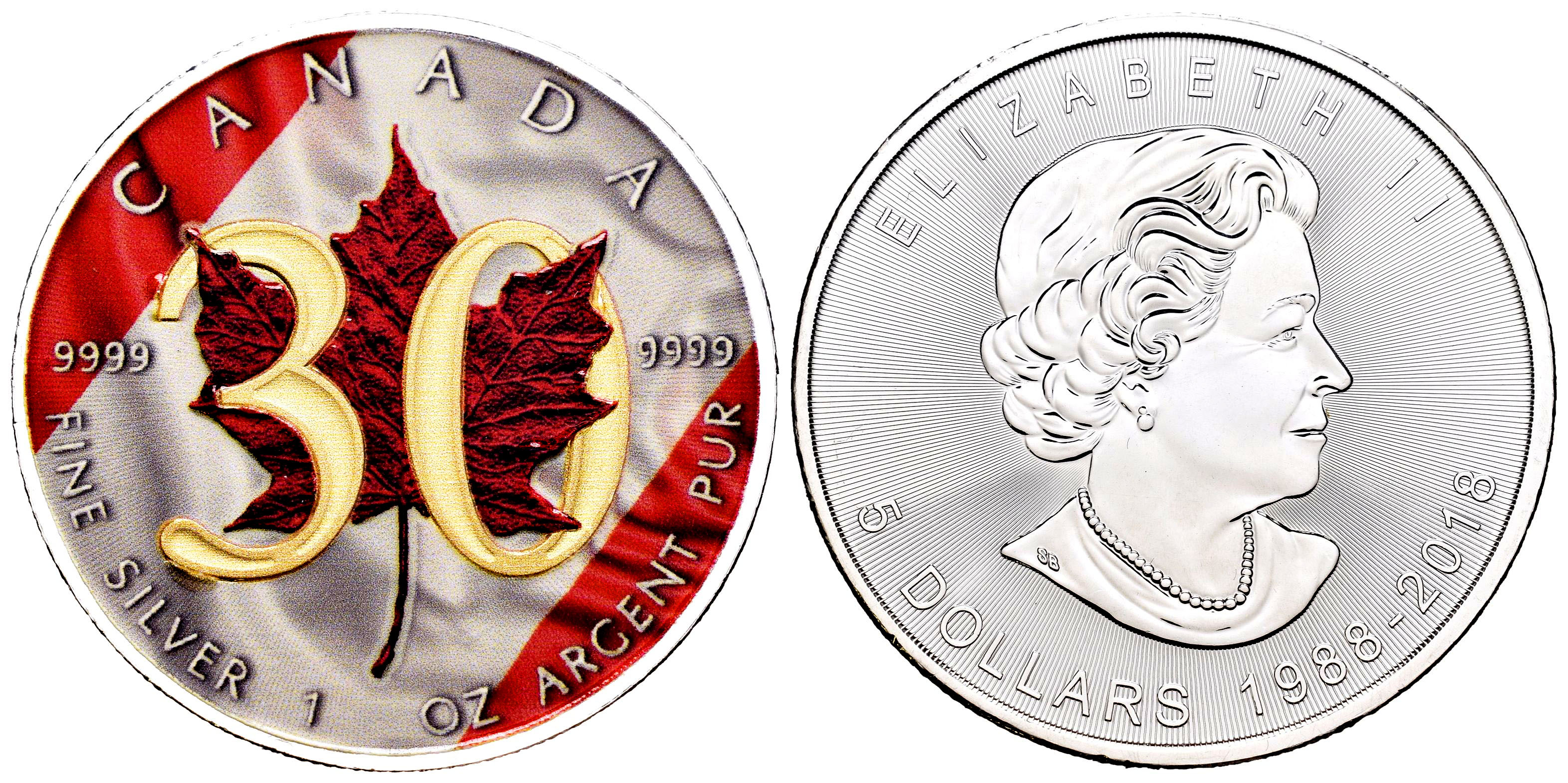Canadá. Elizabeth II. 5 dollars. 2018. Maple Leaf. . 31,11 g. Coloured Edition. 30th Anniversary. Canadian Flag. Con certificado. SC. Est...40,00.