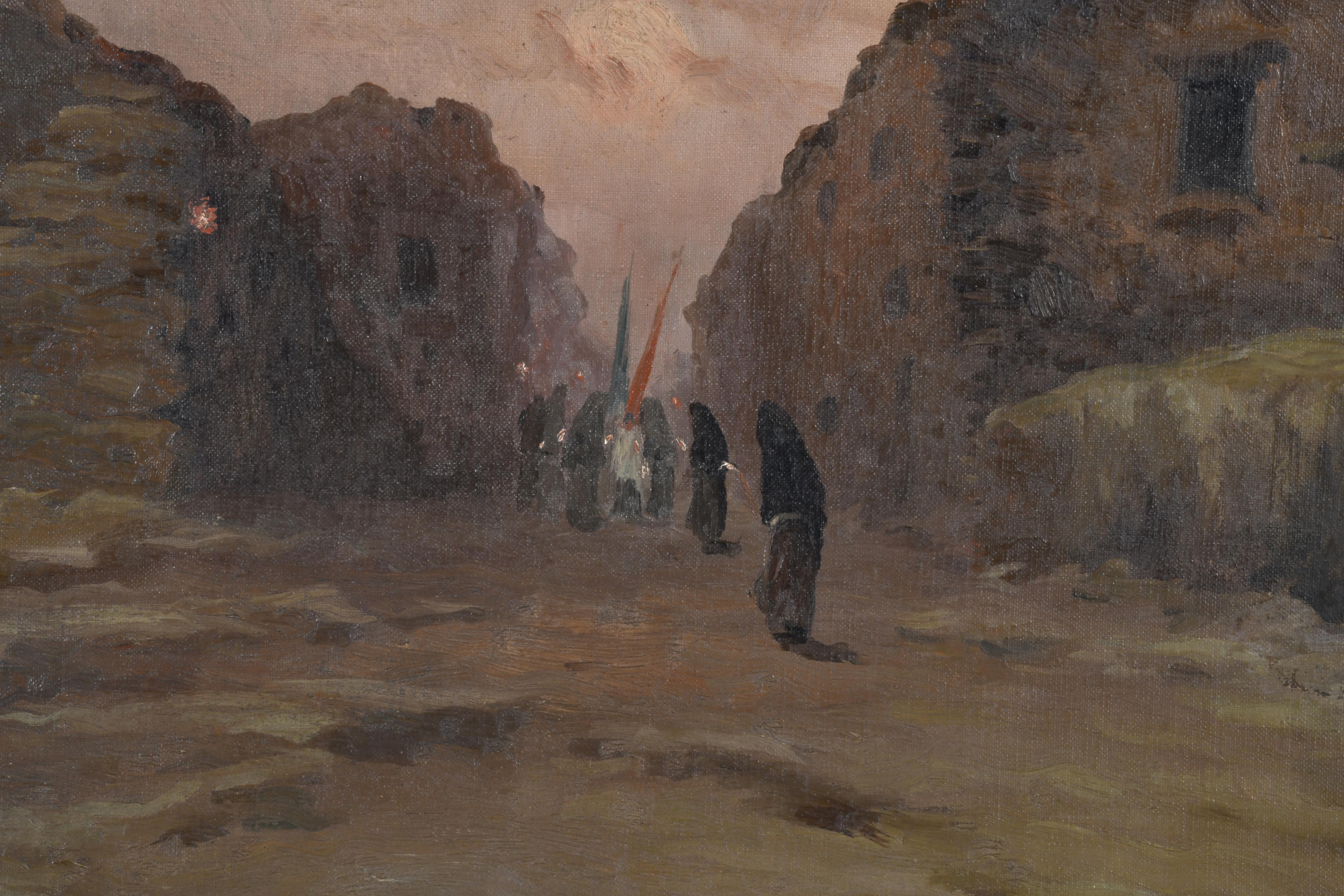 Presenta una pequeña rotura de la tela, así como restauraciones visibles en el reverso e intervenciones en a capa pictórica.