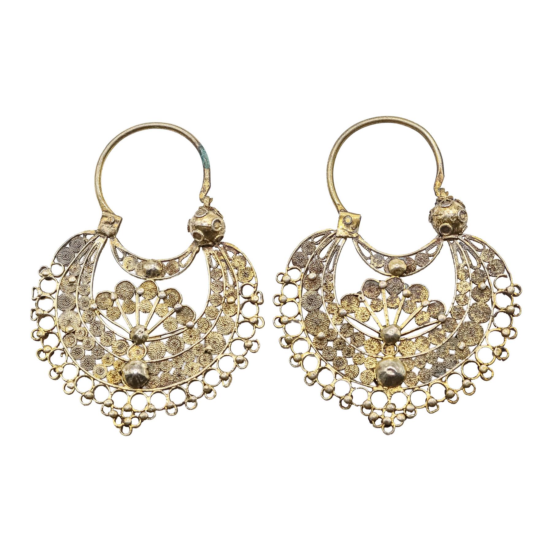 Pendientes criolla de media luna y abanico, con montura de filigrana en plata sobredorada siguiendo modelos del s.XVIII. Cierres de gancho con apertura frontal. Longitud: 5 cm