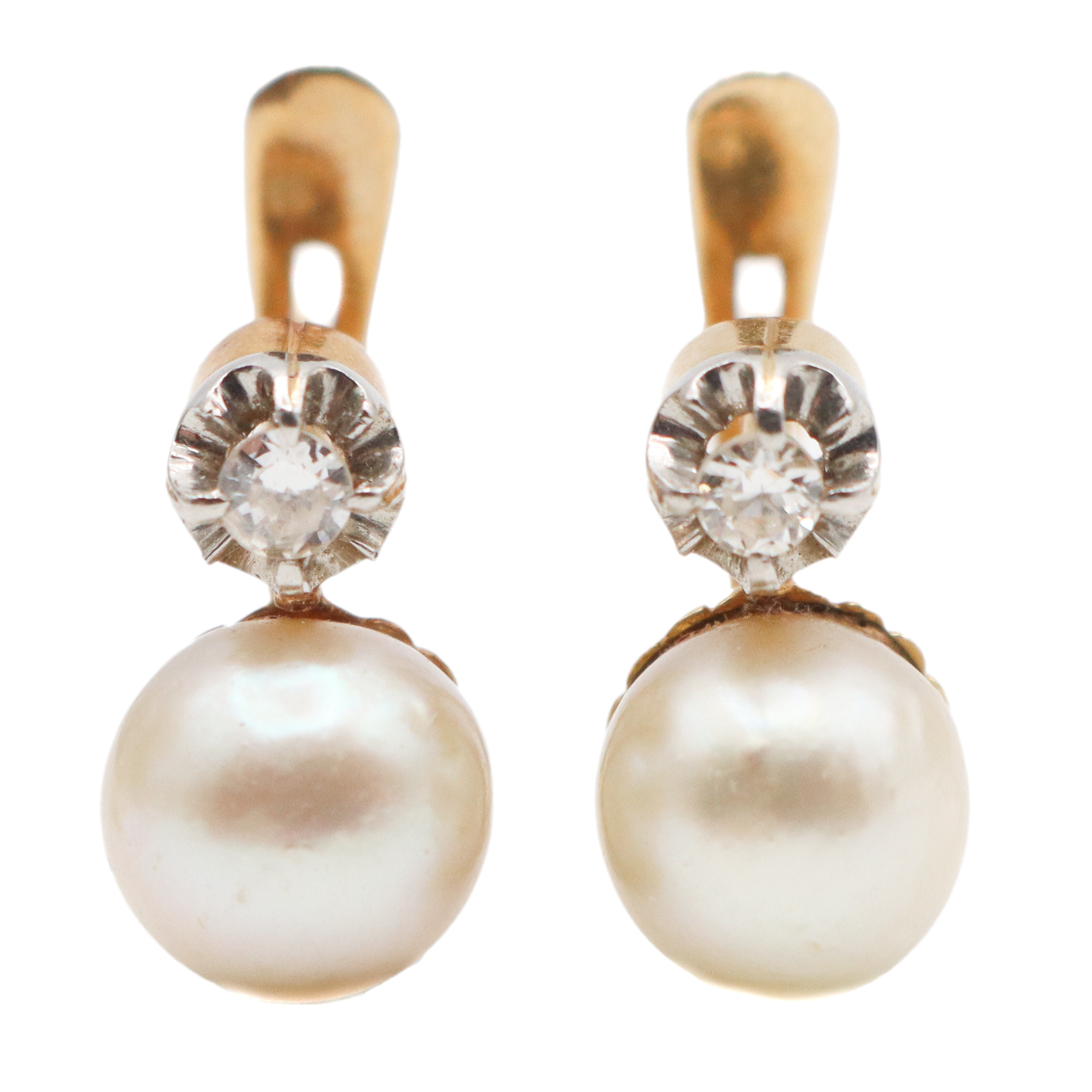 Montura en oro amarillo de 18 kt, con vistas en platino. Con perlas cultivas de 7,8 mm de diámetro coronada por un diamante talla 16/16. Cierre catalán. Peso total: 5 gr.
