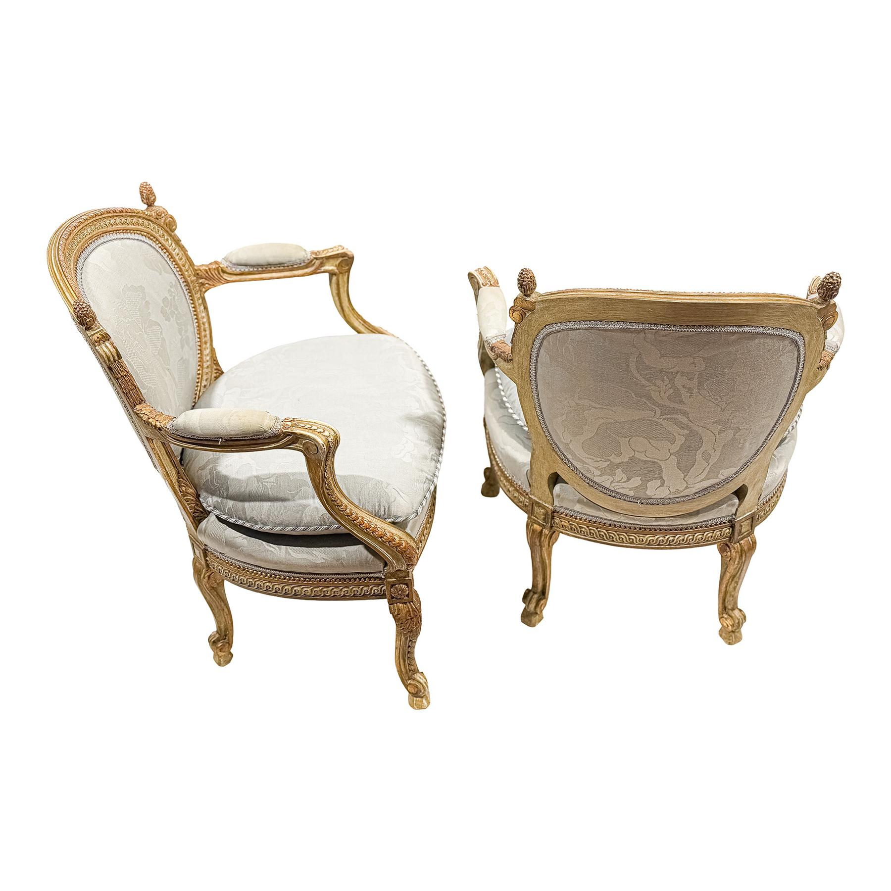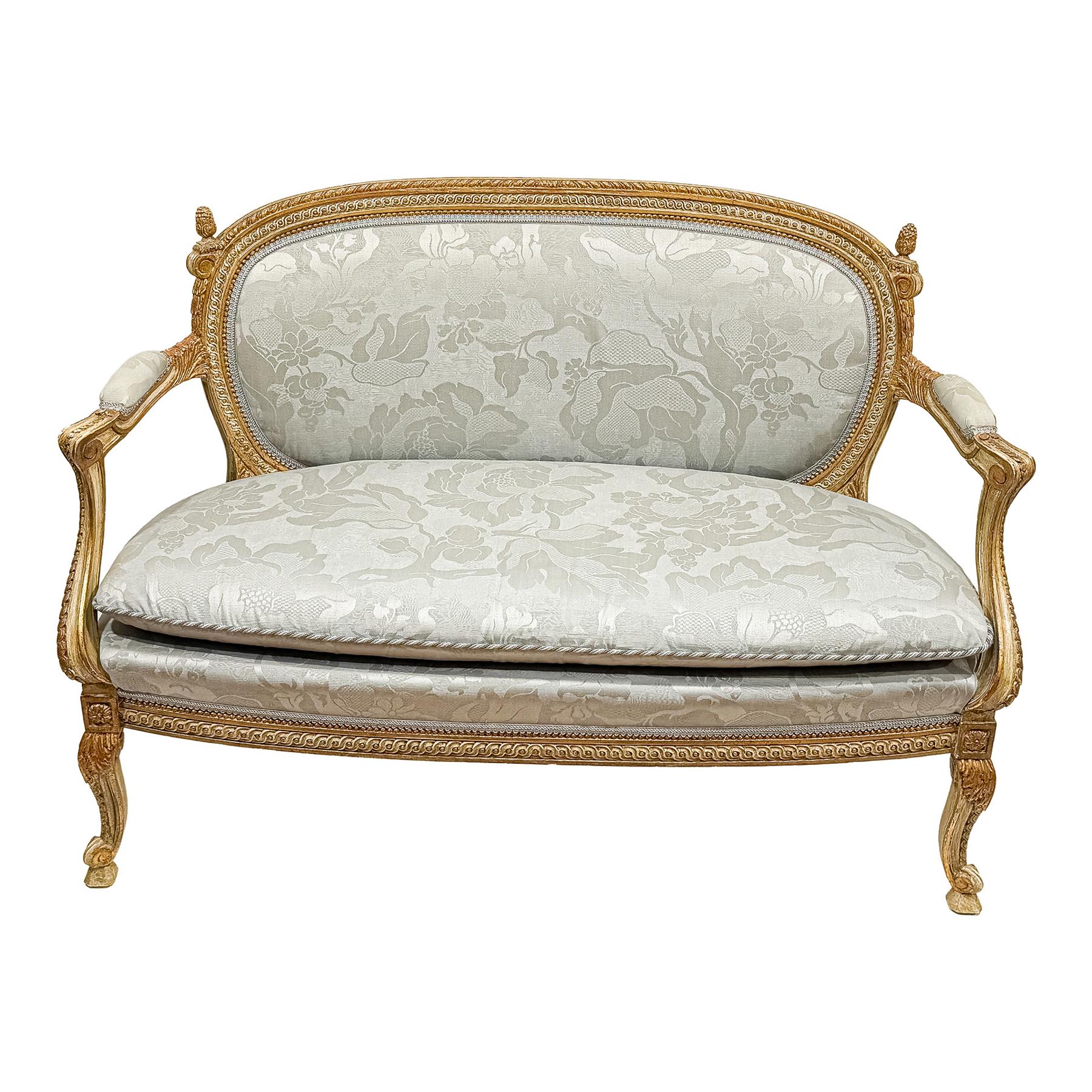 Conjunto de asiento compuesto por un pequeño sofá y dos sillones individuales. Estructura de madera tallada y dorada, respaldo ovalado, brazos curvos y tapicería en tonos claros. Medidas Sofa: 80 x 120 x 43 cm. Medidas sillones: 80 x 62 x 46 cm.