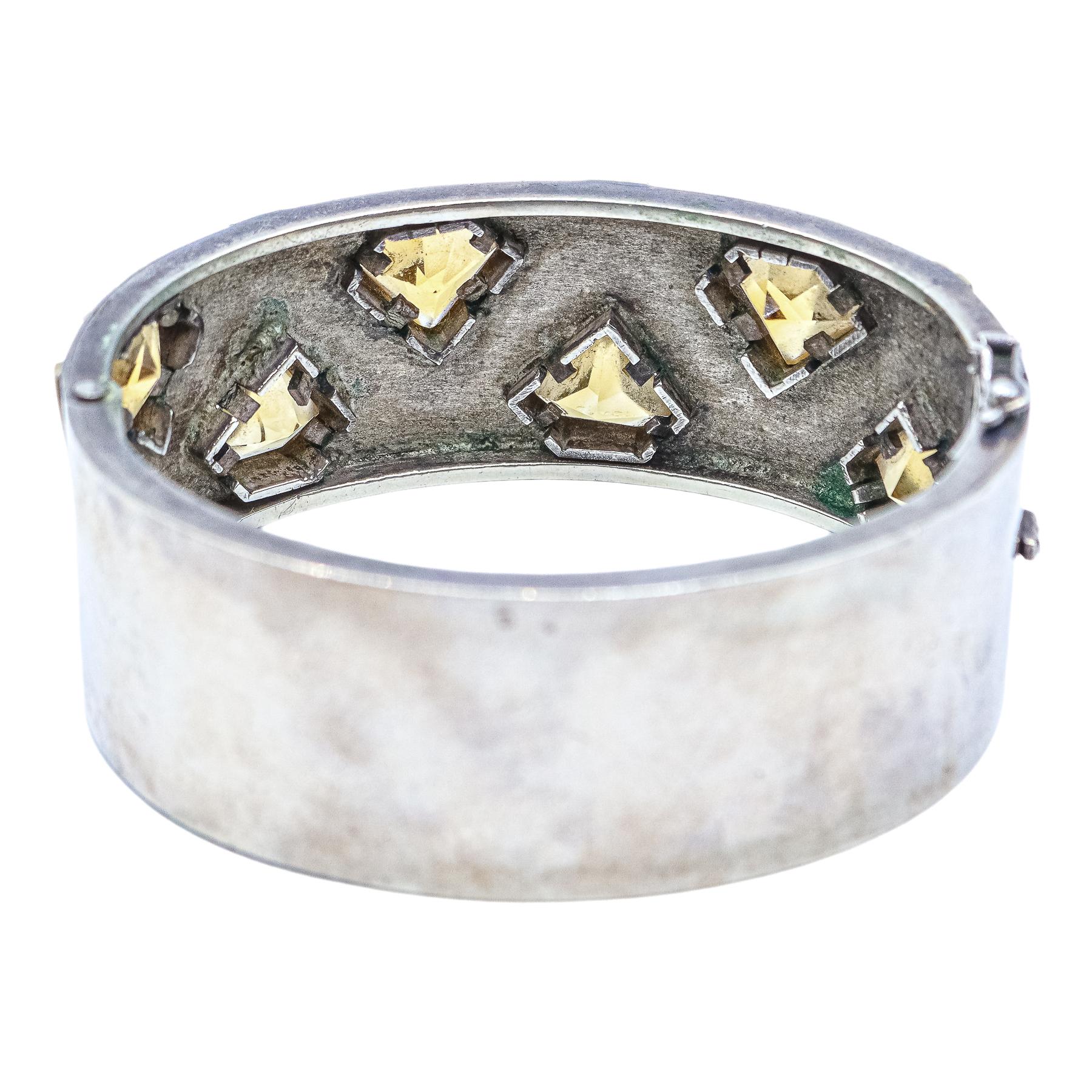 Pulsera esclava ancha con montura en plata con aplicaciones en oro amarillo de 18 kt. Frente con seis citrinos. Cierre invisible de lengüeta con ocho de seguridad. Peso total: 68 gr.