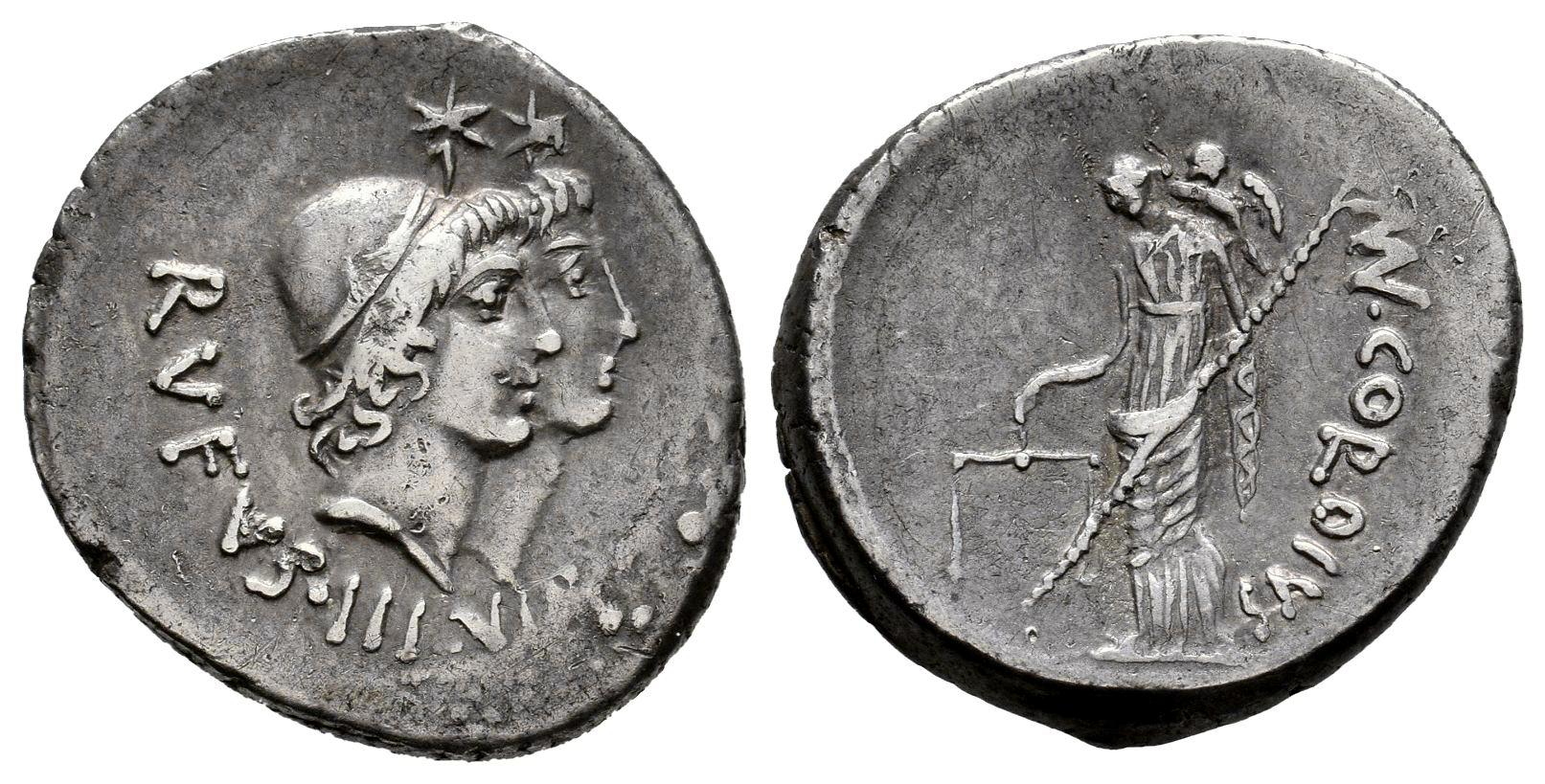 Cordia. Manius Cordius Rufus. Denario. 46 a.C. Roma. (Ffc-602). (Craw-463/1b). (Cal-465). Anv.: Cabezas diademadas de los Dioscuros a derecha, surmontados por sendas estrellas, detrás: RVFVS III. VIR.. Rev.: Venus Verticordia a izquierda, con balanzas y cetro, a sus espaldas cupido, en el campo de la derecha: MN. CORDIVS., (MN entrelazadas). . 4,12 g. MBC+. Est...150,00.