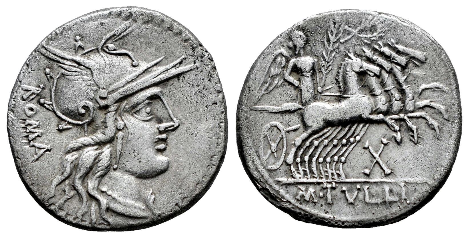 Tullia. M. Tullius. Denario. 120 a.C. Roma. (Ffc-1162). (Craw-280/1). (Cal-1317). Anv.: Cabeza de Roma a derecha, detrás: ROMA,. Rev.: Victoria con palma en cuadriga a derecha, encima del campo: una corona, debajo de los caballos: X,en el exergo: M. TVLLI. . 3,82 g. MBC+. Est...100,00.