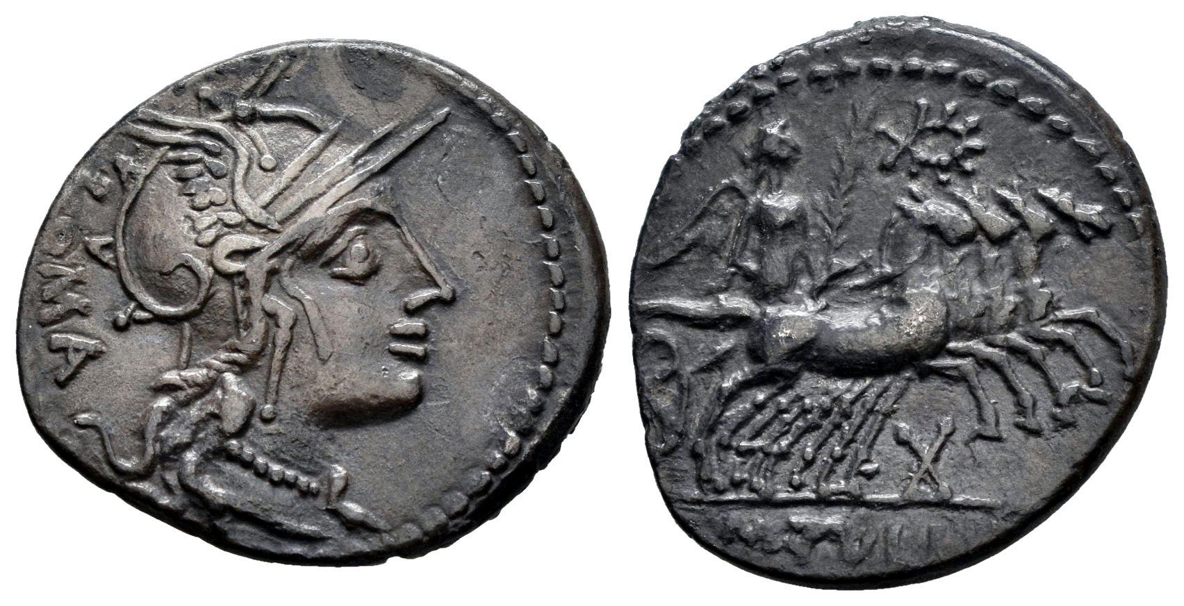 Tullia. M. Tullius. Denario. 120 a.C. Roma. (Ffc-1162). (Craw-280/1). (Cal-1317). Anv.: Cabeza de Roma a derecha, detrás: ROMA,. Rev.: Victoria con palma en cuadriga a derecha, encima del campo: una corona, debajo de los caballos: X,en el exergo: M. TVLLI. . 3,81 g. Pátina original. MBC+/MBC. Est...100,00.