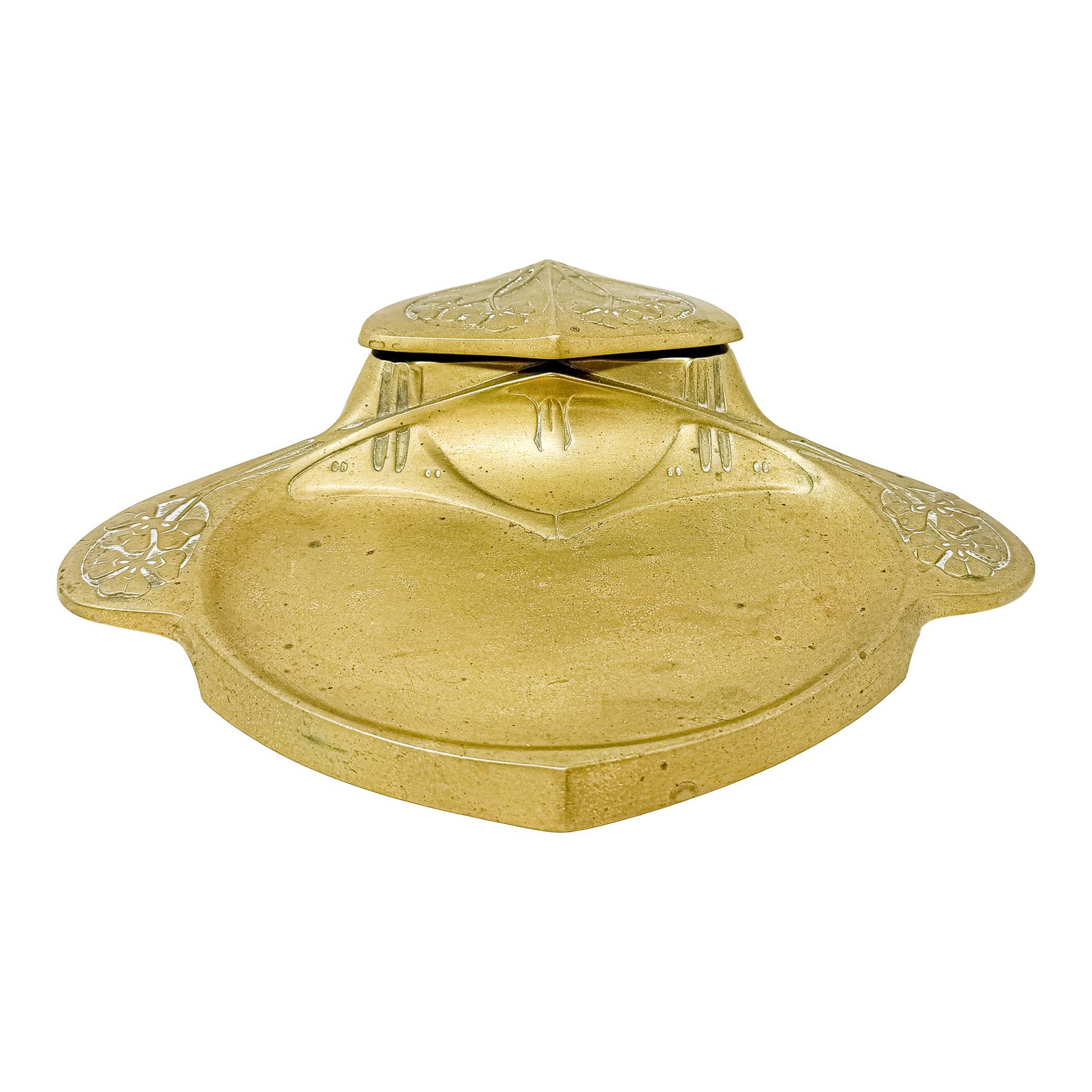 Realizado en bronce pulido con delicada decoración floral en relieve. Tapa abatible con dos tinteros en interior.Medidas: 5 x 30 x 22 cm