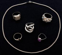 1165 - LOTE DE BISUTERIA COMPUESTO DE 5 ANILLOS Y UNA CADENA DE METAL DORADO